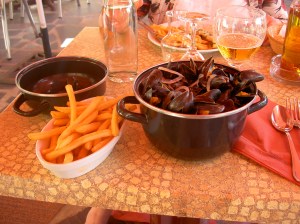 This part of France is also famous for its oysters and mussels. Today I settled for a serve of moules et frites, (mussels in white wine and garlic in one bowl, and chips in another) which was delicious!