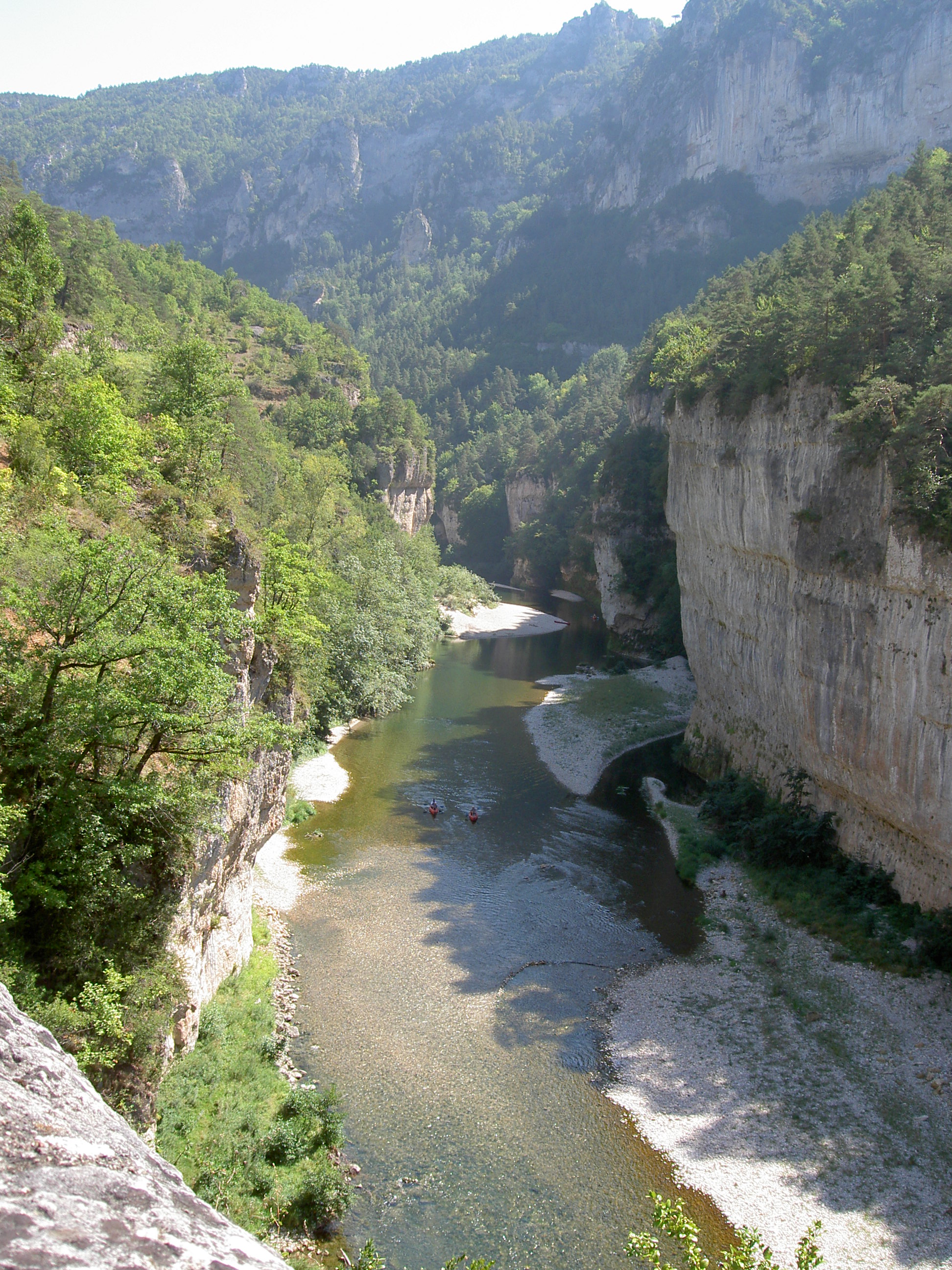 The sun is shining, and it is very pleasant indeed! We are spending two nights here, and this is by far the least shabby of the ancient French hotels we have stayed in! The food in the restaurant is excellent; last night we both had fresh trout, beautifully cooked and presented. Today, our only full day in this part of the world, we had a lovely drive though one of the many gorges of the Tarn River. It was really awe-inspiring. I do not know how deep it is, but it did take 6 kilometres of very twisty hairpin bends to get from the top of the cliffs to the river level. Just the sort of roads the Tour de France cyclists would love!. In addition to the sheer depth of the gorge, there are ruined castles, ancient walled fields, and amazing limestone outcrops left by the river as it dissolved its way down through the rocks over millions of years.